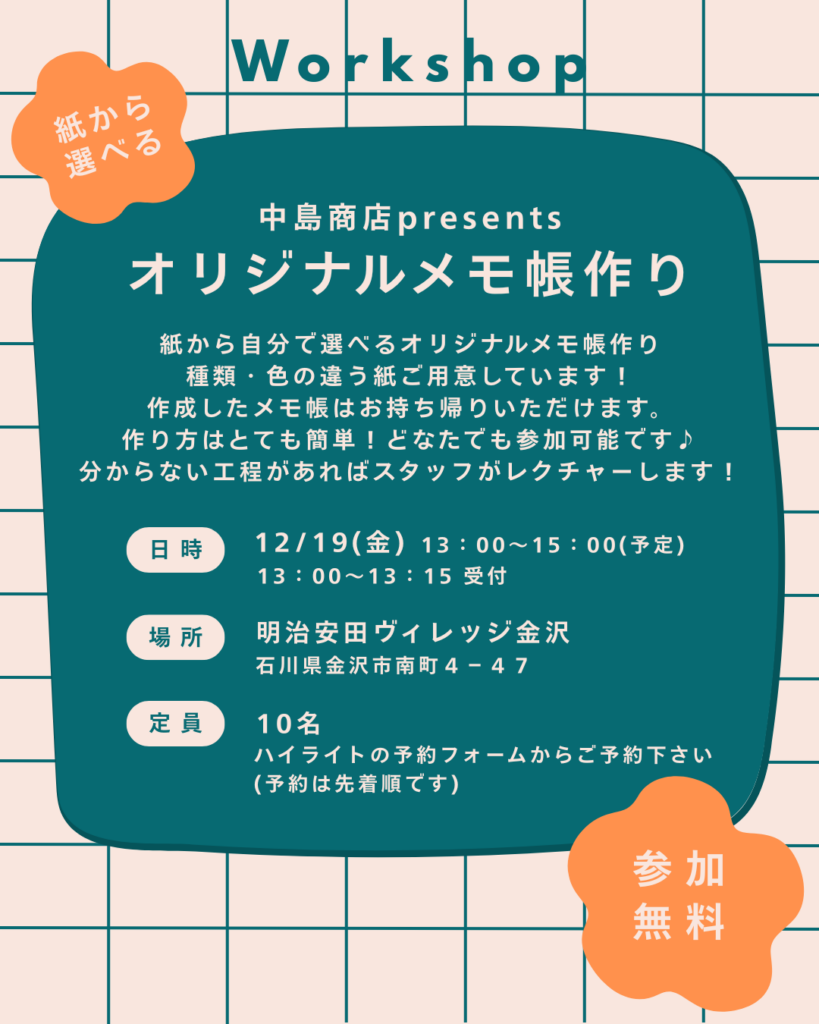 明治安田ヴィレッジ金沢にてオリジナルメモ帳ワークショップを開催します。